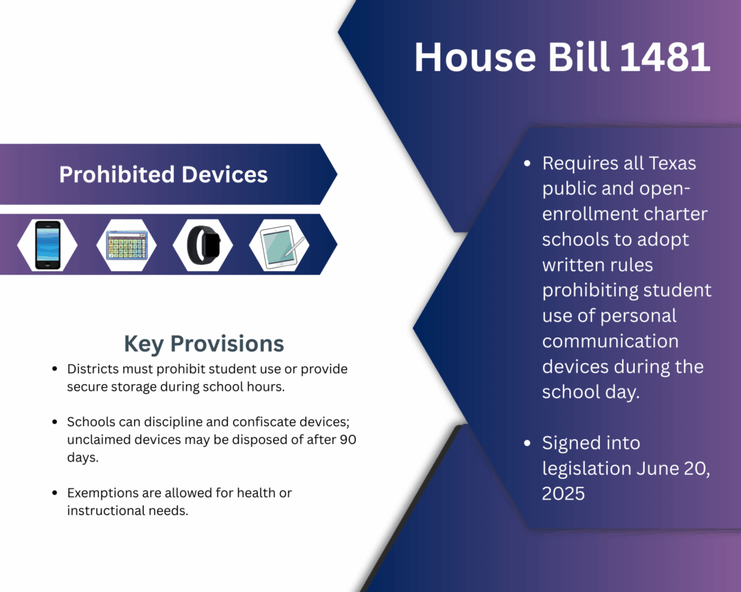 Regarding prohibitive devices in schools. Signed into legislation June 20th, 2025. Click on link below for more details. House Bill 1481 flyer